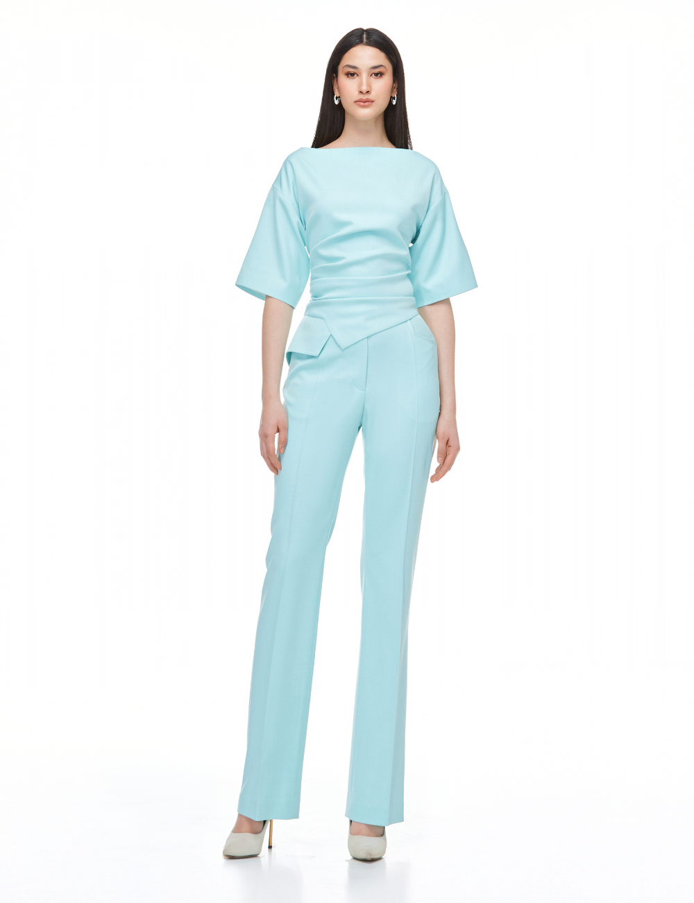 The model with asymmetric fragment looks casual and at the same time very elegant and stylish. The image can be perfectly combined with a blazer in tone and long pants, visually lengthening the silhouette. The high-quality fabric is very breathable and the look is perfect for both business day and evening out.